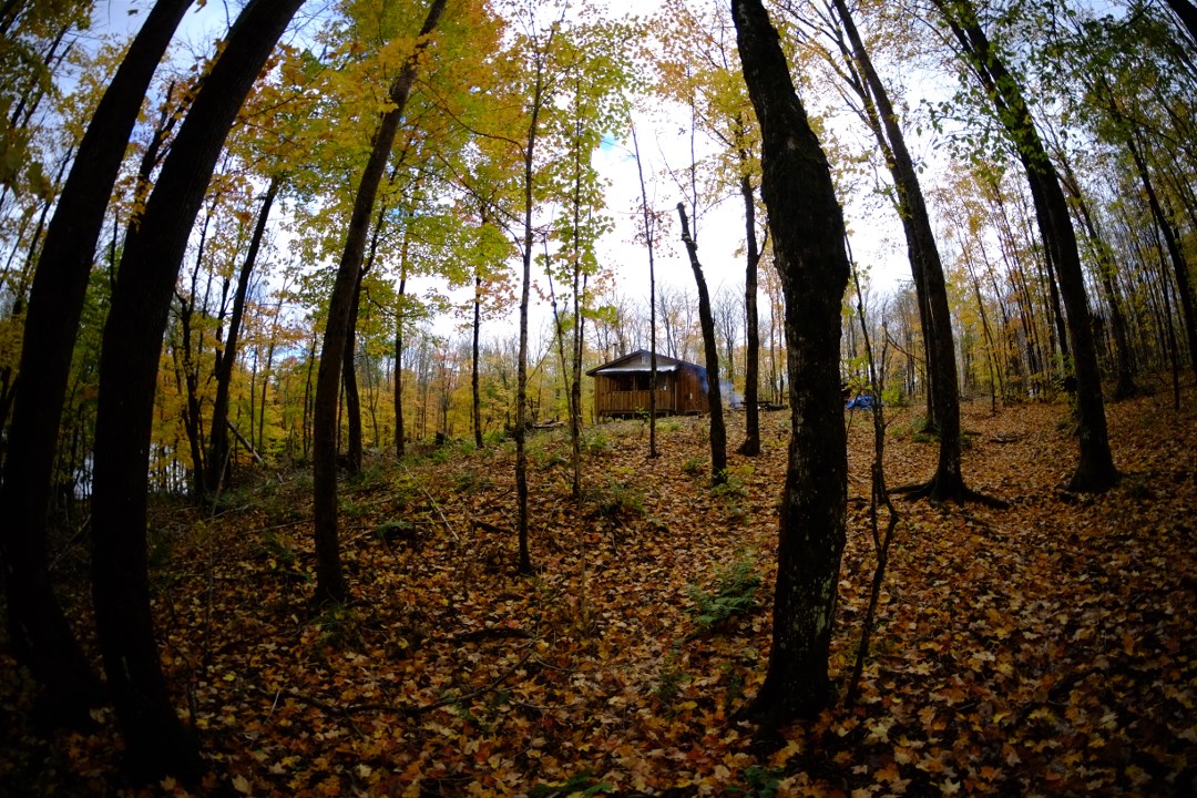 Meanwhile another lake in the middle of our dirt road was filled in. Only three rough spots to go. For pictures I experimented with the 10mm fish eye. That is why the trees seem to bend. The forest floor is carpeted in leaves and the canopy is bare compared to last week.