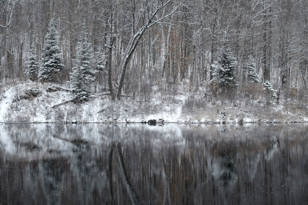 The only time we saw the sun was for about 45 minutes at sunrise so I went down to the river to get a few more photos. I did not bring the telephoto lens. There was a pretty big beaver. Every time I moved it slapped the water with its tail and dived. I cropped the photo heavily so you can see it is an animal.